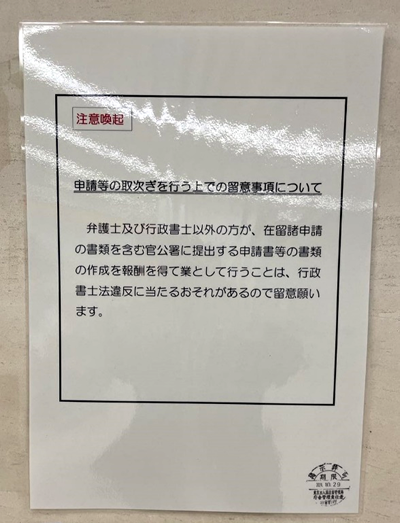 令和6年度国家予算要望(東京都行政書士会・東京行政書士政治連盟)の要望事項で、各地方出入国在留管理官署の申請窓口に「弁護士及び行政書士以外の者が、在留諸申請の書類を含む官公署に提出する申請書等の書類の作成を報酬を得て業として行うことは、行政書士法違反に当たるおそれがあるので留意願います」を、申請窓口にプレートやポスター等を設置し、日本語と外国語で表示する等、窓口に来た全ての人が視覚的に認知できるよう、周知・徹底を強化されたい、と要望しました。その結果、2023年10月29日より品川の東京出入国在留管理局内に注意喚起のポスターを掲示していただいております。